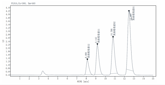 可以用液相色譜檢測中藥材中的黃曲霉毒素B1、B2、G1、G2,具體方法如下: