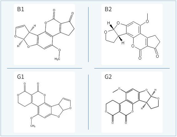 目前共發(fā)現(xiàn)有20多種黃曲霉毒素,其中食品中常見且危害極大的有黃曲霉毒素B1、B2、G1、G2四種。