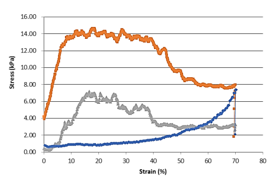 ● 圖1中的另外兩條曲線分別表示配方2 (灰色) 和配方3 (藍(lán)色) 。配方2的楊氏模量為0.473 kPa,最大應(yīng)力為7 kPa;
