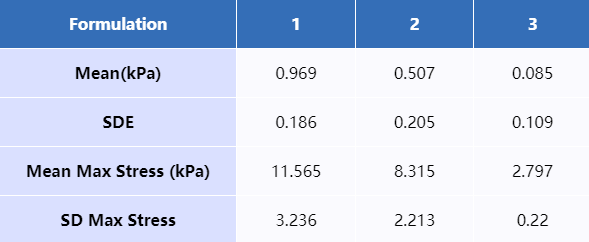● 配方1的平均楊氏模量為0.969 kPa,配方1中最強(qiáng)的值為圖1中的橙色。該蛋糕的楊氏模量為1.246 kPa,最大應(yīng)力為17.600 kPa;