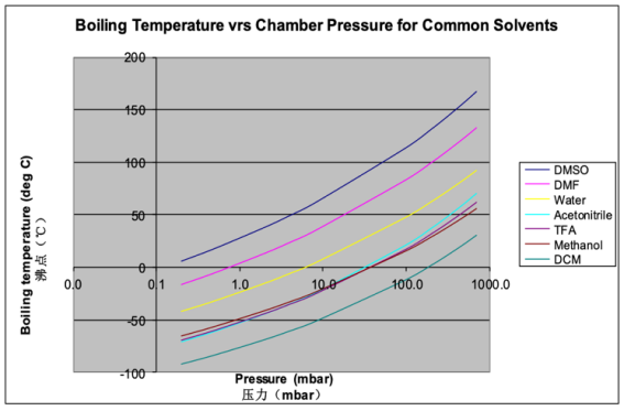 那有沒(méi)有一種方法可以高效去除這類(lèi)高沸點(diǎn)有機(jī)溶劑的同時(shí)又可以解決以上問(wèn)題呢?我們知道溶劑的沸點(diǎn)隨著壓力降低而降低,當(dāng)壓力降到一定程度時(shí),在較低的溫度條件下,溶劑便沸騰蒸發(fā)。既能使高沸點(diǎn)溶劑得已去除,又可在保證較低的溫度對(duì)樣品進(jìn)行保護(hù)。如DMSO在1mbar的真空度條件下溶劑的沸點(diǎn)降至25℃。