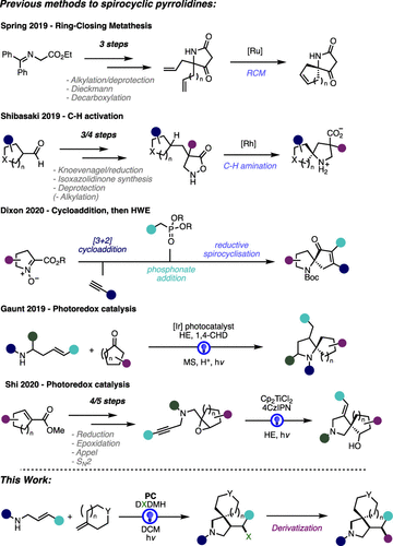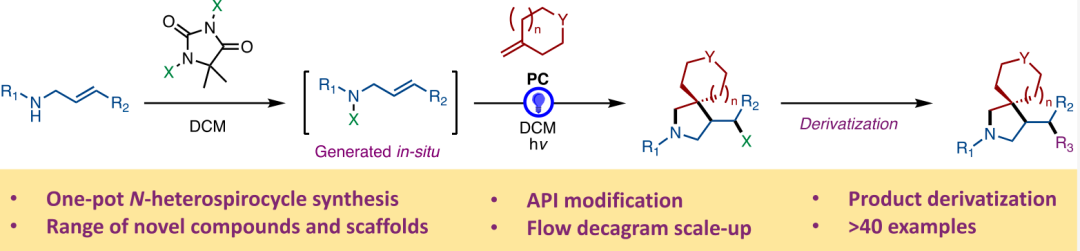 在近年來發(fā)展的疊雜雜螺環(huán)的大多數(shù)制備方法中都需要多步步驟。然而,光催化的新應(yīng)用可以使合成步驟大大減少。作者利用光催化生成N-中心自由基,可構(gòu)建多種β-螺環(huán)吡咯烷,包括藥物衍生物。利用流動化學(xué)技術(shù),還證明了產(chǎn)品的進一步衍生化具有可行的放大程序。