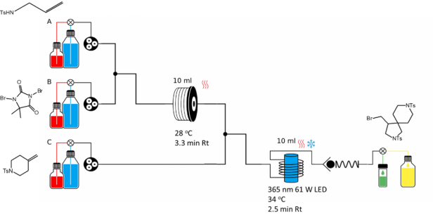 圖6:使用Vapourtec UV-150光化學(xué)反應(yīng)器合成復(fù)雜的螺環(huán)化合物