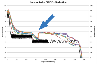 熱電偶跡線描述了常規(guī)凍結(jié)中成核的隨機(jī)性質(zhì)和ControLyo®過程中的瞬時(shí)成核(如圖1和圖2所示)。
