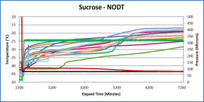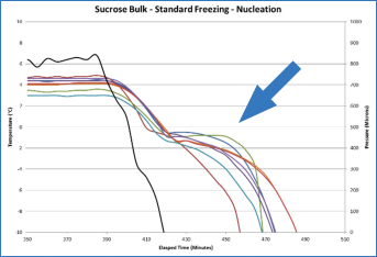 在常規(guī)冷凍過程中,成核隨機(jī)發(fā)生,熱電偶顯示成核發(fā)生在不同的溫度和時(shí)間下??刂瞥珊思夹g(shù)中,當(dāng)系統(tǒng)減壓時(shí),熱電偶立即記錄到同時(shí)成核的過程。需要認(rèn)識(shí)到傳感器只測量托盤的某些區(qū)域,可能不能代表托盤全部。