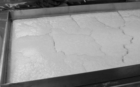 通過蔗糖和甘露醇冷凍干燥生產(chǎn)的凍干餅的物理外觀在常規(guī)和控制成核策略之間有所不同。ControLyo®產(chǎn)生了一致的蛋糕結(jié)構(gòu)和外觀。兩種處理方法在甘露醇的外觀上差異不大。然而,蔗糖蛋糕的外觀有顯著差異:未經(jīng)控制的冷凍蛋糕上的裂縫更少,從托盤的一側(cè)延伸到另一側(cè)(圖5)。當(dāng)使用ControLyo®時(shí),蛋糕上的裂縫更寬,更均勻(如圖6所示)。