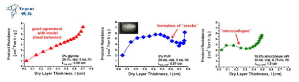 當升華過程中,產品結構發(fā)生塌陷、微塌陷或開裂等,在產品內部會形成一定的額外升華通道,通常情況下產品阻力會降低,這個時候也可以通過產品阻力數據或曲線來追蹤樣品是否發(fā)生了如上的這些質量現象,從而進一步進行工藝調整,優(yōu)化產品質量。如圖1,第一張是正常升華的阻力曲線圖,隨著干燥層的厚度增加,阻力呈現逐漸上升的趨勢,后面兩張是產品發(fā)生開裂和微塌陷時,升華阻力在中間出現了突然降低的現象。