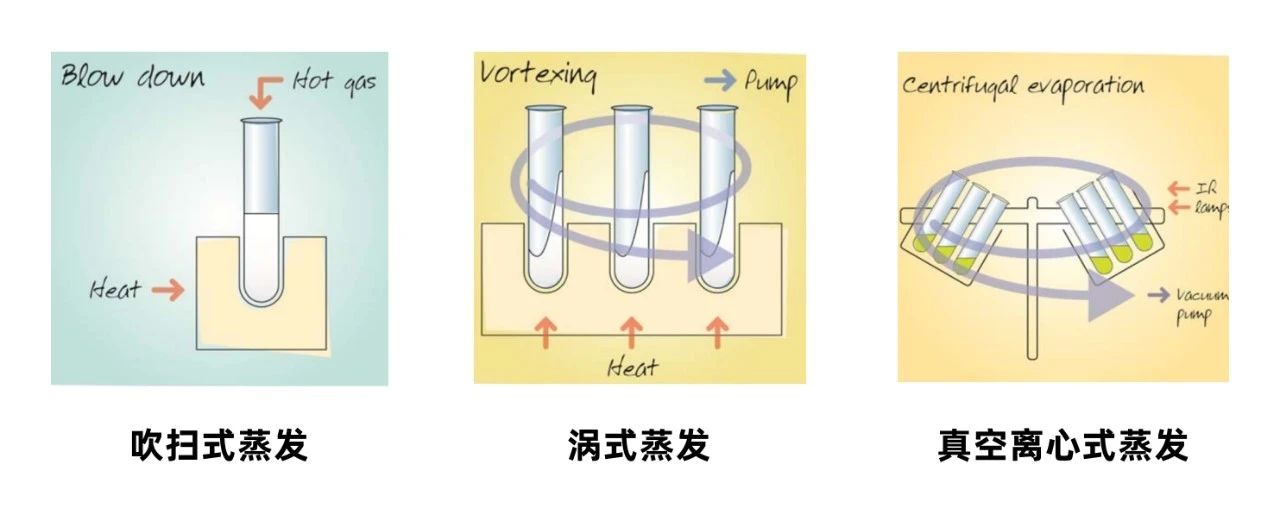 在樣品制備方法的蒸發(fā)部分傳統(tǒng)上依賴于使用旋轉(zhuǎn)蒸發(fā)器,然而,它有許多操作缺陷。最大的缺點是旋轉(zhuǎn)蒸發(fā)器是一個單樣品系統(tǒng),需要連續(xù)監(jiān)測以控制過程并確保不發(fā)生起泡或暴沸。硝基呋喃樣品通常以批次多樣品的形式送達實驗室,如果使用旋轉(zhuǎn)蒸發(fā)器可以在有限的時間內(nèi)處理小批量樣品,那么處理大批量樣品時很快就會變得無法處理。因此,實驗人員針對吹掃式蒸發(fā)、渦式蒸發(fā)及真空離心式蒸發(fā)三種方式進行考察,結(jié)果如下: