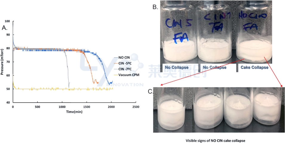圖8:(A)Pirani和電容式壓力計在中度激進工藝(Tshelf-25 °C)過程中的壓力讀數(shù)(B.)中度激進工藝后NOCIN、CIN-5℃和CIN-7℃產(chǎn)品的外觀,顯示NOCIN中肉眼可見的宏觀塌陷跡象。(C) NOCIN產(chǎn)品的放大圖像,證實肉眼可見的蛋糕塌陷
