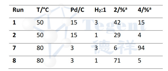 表1:給出產(chǎn)物2和產(chǎn)物4的選擇性生產(chǎn)的早期實(shí)驗(yàn)和條件;Pd/C負(fù)載以催化劑在乙酸乙酯中的毫克/毫升測(cè)量