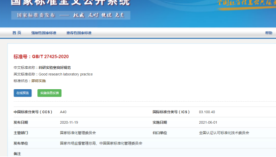 中國國家標準化管理委員會平臺發(fā)布了《科研實驗室良好規(guī)范》(GB/T27425-2020)標準,20210601日起實施,此《科研實驗室良好規(guī)范》規(guī)定了科研實驗室良好規(guī)范(簡稱GRLP),包括管理要求和技術要求,是有關科研實驗室運行、運行條件以及研究活動的計劃、實施、檢查、記錄、存檔和報告的一套規(guī)范體系,彌補了國內(nèi)科研實驗室良好規(guī)范領域的空白。