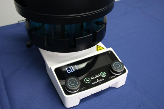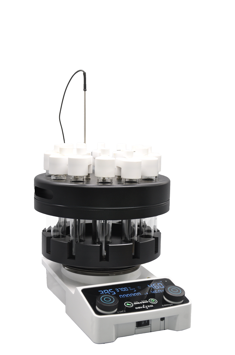 EasySyn-12位于英諾德WM-1磁力攪拌器上,可同時加熱至室溫至180?C的12次反應(yīng),精度為±1?C。通過WM-1的Pt1000溫度傳感器實現(xiàn)更高的精度。Pt1000溫度傳感器允許用戶通過塊溫或溶液溫度進行控制。將溫度傳感器插入鋁基座或通過蓋子直接插入反應(yīng)溶液中。
