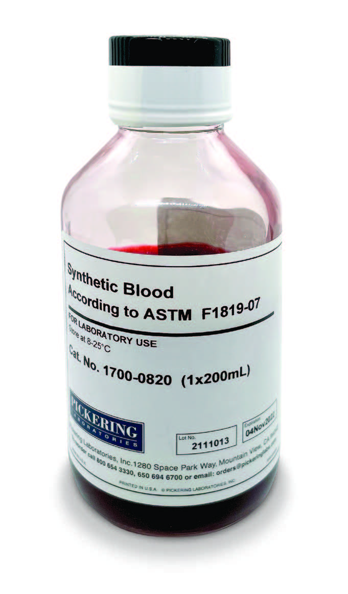 Pickering人工血液是根據(jù)官方標準 ASTM F1819-07、ASTM F1670、ASTM F1862 和 ASTM F2100 配置的,使該產(chǎn)品具有接近人體血液的表面張力和粘度。 此外,該溶液的顏色旨在模仿真正的人類血液的外觀。 該配方可用于評估防護服所用材料的抗血液穿透性能,還可用于評估與人體皮膚長時間接觸的材料的吸收能力。