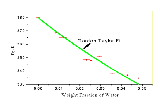 配方里的不同組分有些可以作為塑化劑,改變整個(gè)配方的韌性和軟硬度。水也可扮演類似的角色,從而改變樣品的Tg。DSC可幫助我們很好的測(cè)量不同配方或者殘留水分含量時(shí)的Tg,或者我們可以使用Gordon-Taylor方程來進(jìn)行計(jì)算——只要知道各個(gè)組分的Tg并知道每個(gè)組分的質(zhì)量分?jǐn)?shù),就可以計(jì)算出Tg。