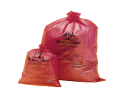堅鮮紅色聚丙烯袋包括黑色的生物危害符號和預(yù)防措施,印刷在四種語言(英語,西班牙語,法...