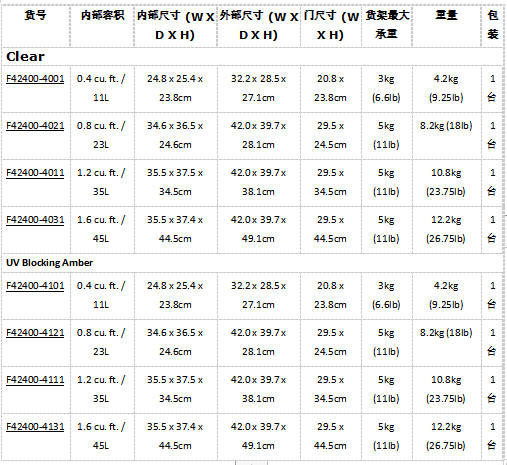 ? 八種型號(hào)可供選擇;11、23、35和45升內(nèi)部容積和透明或防紫外線琥珀色型號(hào)