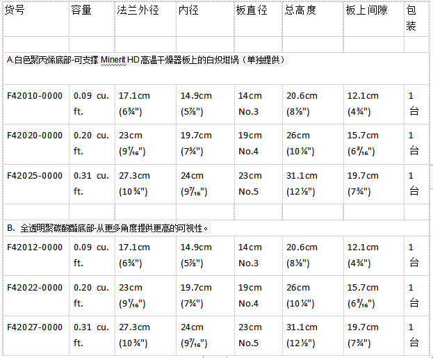 ? 所有型號(hào)均包括0.32 cm(?”)厚的多孔板;可在該板上或下面放置一次性或可重復(fù)使用的干燥劑
