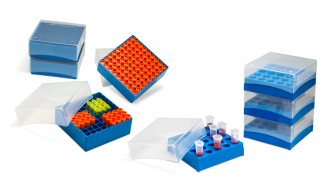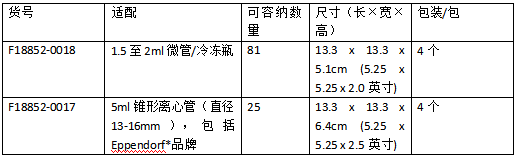 耐低溫的塑料凍存盒有兩個尺寸:可容納81個1.5-2ml的微型管/冷凍瓶凍存盒和可容納25個5ml的錐形離心管(包括Eppendorf 品牌)。